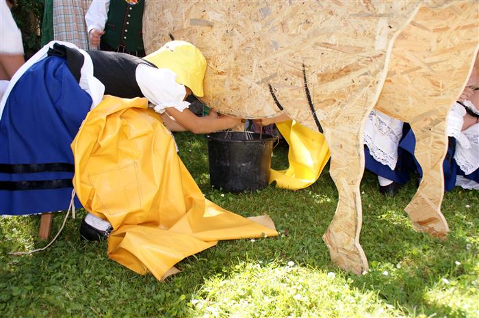 Die 1. Station führte dann einige gleich zu Schwierigkeiten, wenn sie zu fest an den Eutern der Holzkuh zogen und dann die ganze Gruppe nochmal melken musste. Aber insgesamt machten es alle Kinder in ihren gelben Schürzen und Hüte die Sache gut.