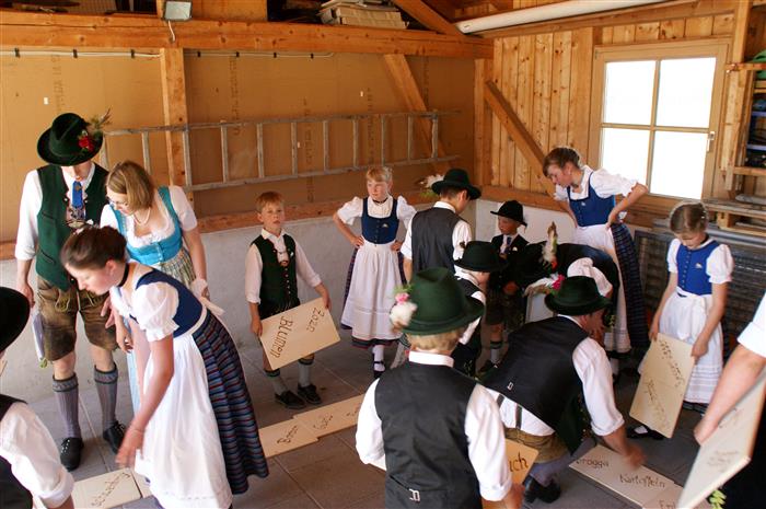 Die 5. Station wurde aufgeteilt in Plattler, Volkstanz und Singen. Die kleineren Kinder übten für den großen gemeinsamen Tanz die Kreuzpolka als Volkstanz ein, die älteren plattleten die Kreuzpolka und dann sangen noch einige die selbstgetexteten Strophen zur Melodie der Kreuzpolka.