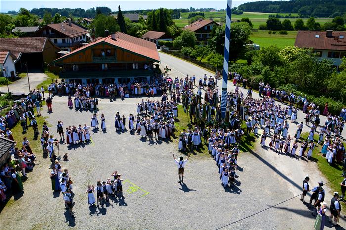 Nach der Andacht maschierten alle ca. 500 Teilnehmer zum Dorfplatz, stellten sich hier sternförmig auf und führten zusammen die einstudierte Kreuzpolka aus Plattler, Volktänzern und Sängern auf.